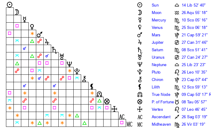 | Sun | 14 Libra 52 | 15 Libra 40 | 26 Sagittarius 15 |