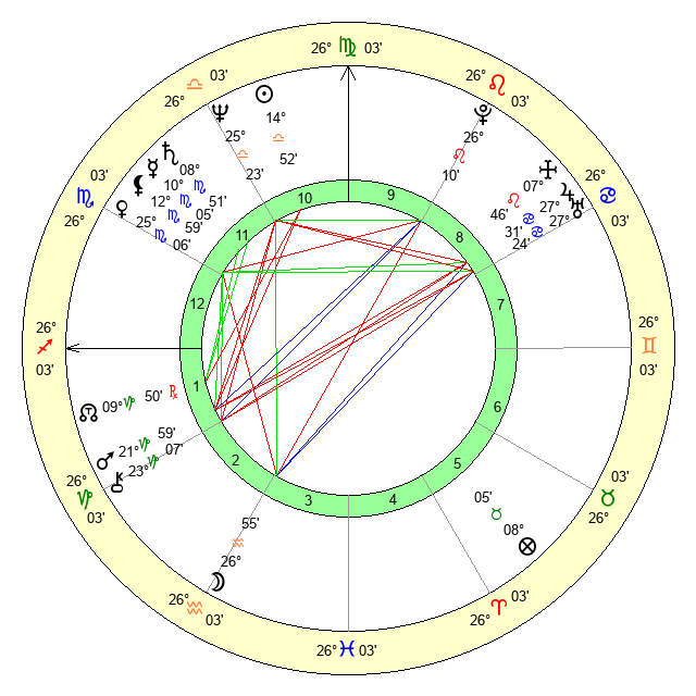 | Venus | 25 Scorpio 5 | 23 Virgo 35 | 17 Scorpio 42 |