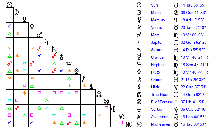 | Sun | 14 Taurus 39 | 15 Taurus 7 | 12 Cancer 10 |