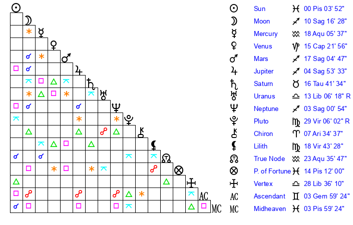 | Neptune | 3 Sagittarius 0 | 28 Pisces 33 | 2 Sagittarius 39 |