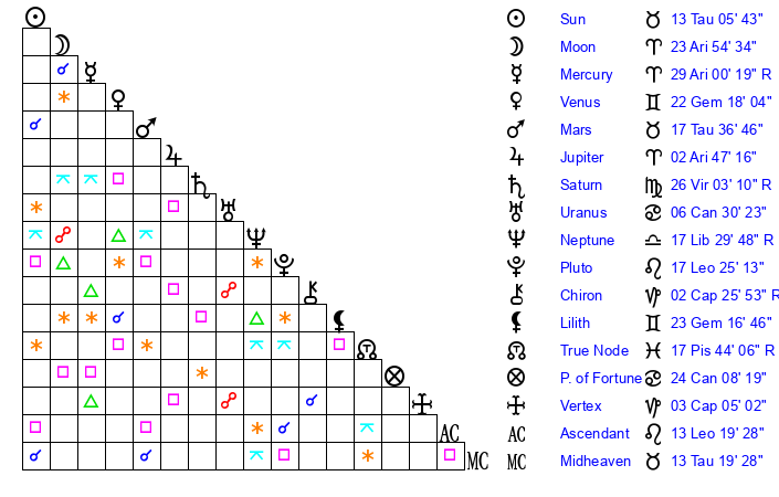 Sun | 13 Taurus 5 | 14 Taurus 9 | 23 Cancer 59 |