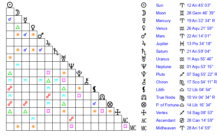 | Sun | 12 Aries 45 | 13 Aries 12 | 9 Taurus 10 |