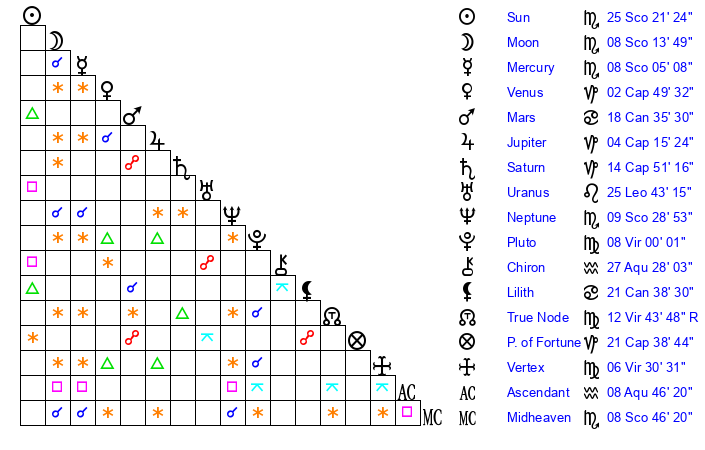 | Neptune | 9 Scorpio 28 | 29 Pisces 30 | 11 Scorpio 11 |