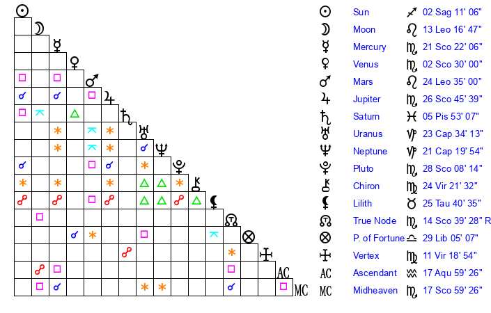 | Pluto | 28 Scorpio 8 | 0 Aquarius 5 | 29 Scorpio 16 |
