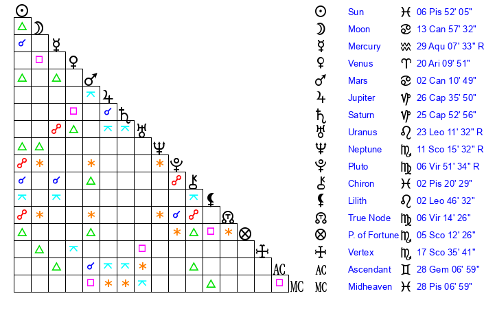 | Sun | 6 Pisces 52 | 7 Pisces 20 | 10 Taurus 6 |