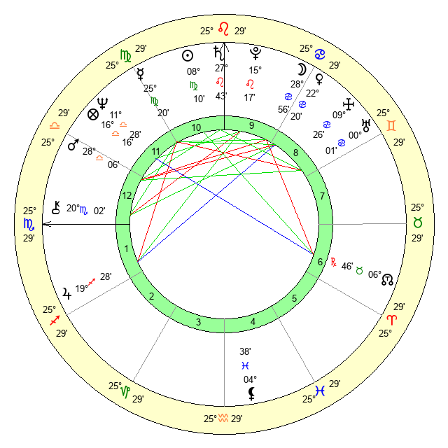 | Saturn | 28 Leo 10 | 29 Pisces 55 | 5 Virgo 50 |