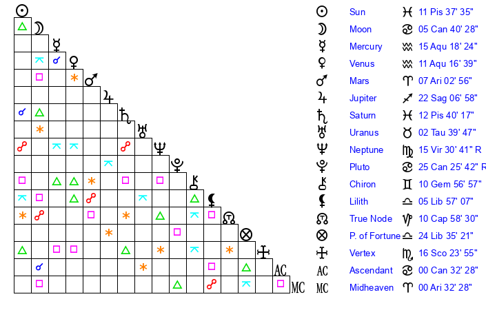 Sun | 11 Pisces 37 | 12 Pisces 2 | 8 Gemini 45 |