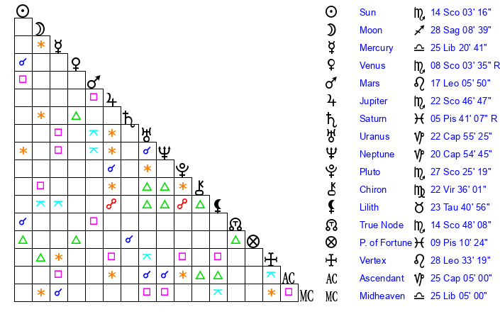| Pluto | 27 Scorpio 25 | 29 Capricorn 47 | 28 Scorpio 36 |