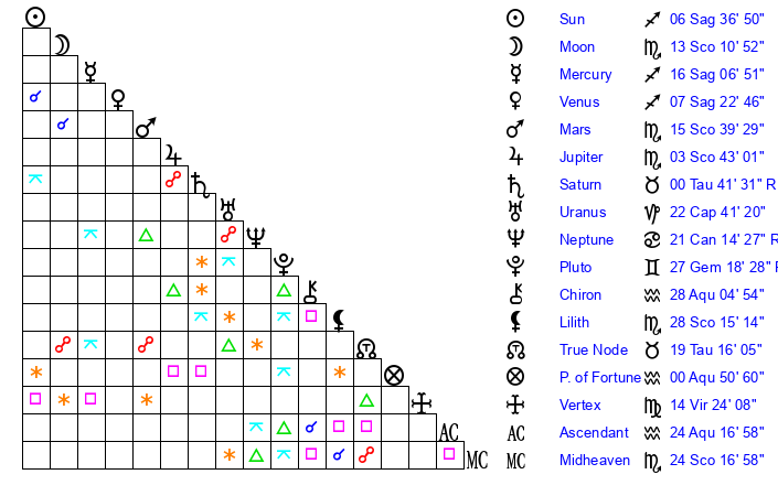 | Saturn | 1 Taurus 19 | 12 Pisces 48 | 5 Taurus 31 |