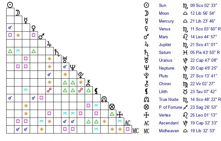 | Moon | 12 Libra 55 | 11 Scorpio 46 | 21 Scorpio 5 |