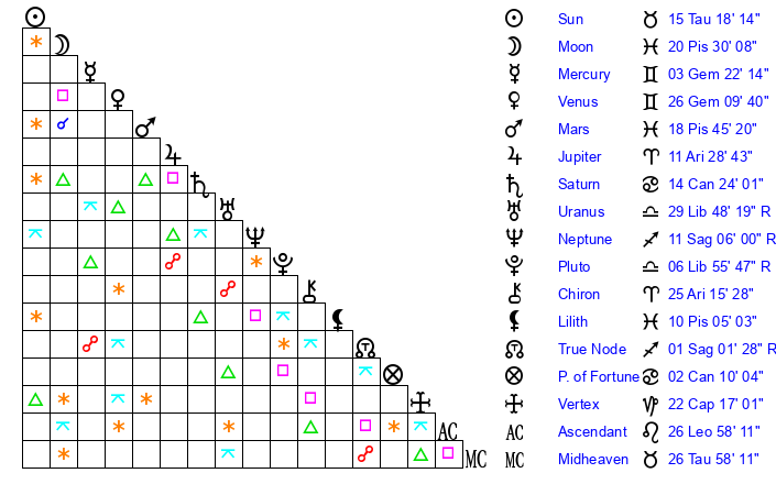 | Mars | 18 Pisces 46 | 8 Leo 9 | 25 Aries 55 |