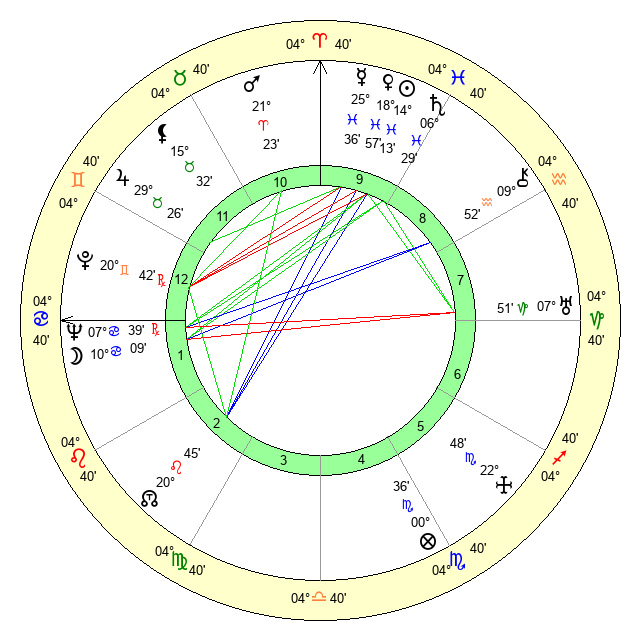 | Moon | 10 Cancer 5 | 2 Gemini 39 | 21 Scorpio 27 |