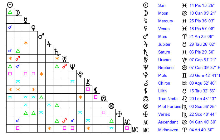 | Sun | 14 Pisces 14 | 15 Pisces 22 | 9 Cancer 52 |
