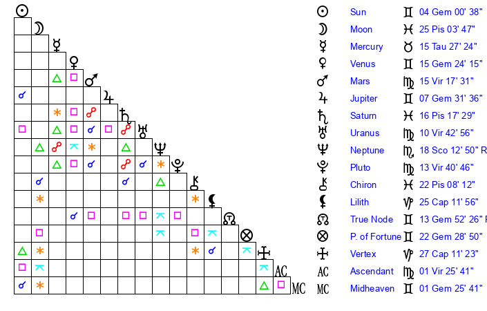 | Neptune | 18 Scorpio 12 | 1 Aries 44 | 17 Scorpio 14 |