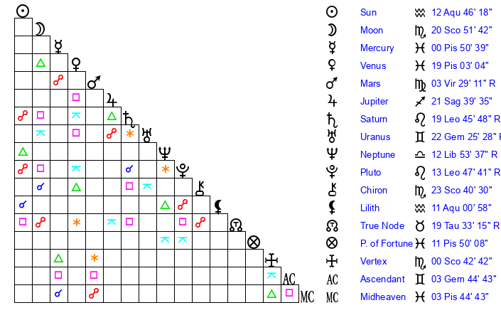 | Sun | 12 Aquarius 46 | 14 Aquarius 6 | 29 Aries 32 |