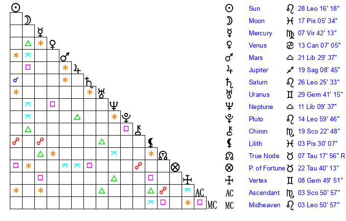 | Pluto | 14 Leo 59 | 1 Aquarius 58 | 16 Leo 31 |