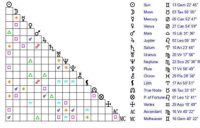 Sun | 13 Gemini 23 | 14 Gemini 19 | 8 Leo 45 |
