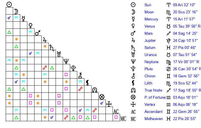 | Moon | 20 Scorpio 18 | 27 Aries 17 | 5 Aquarius 19 |