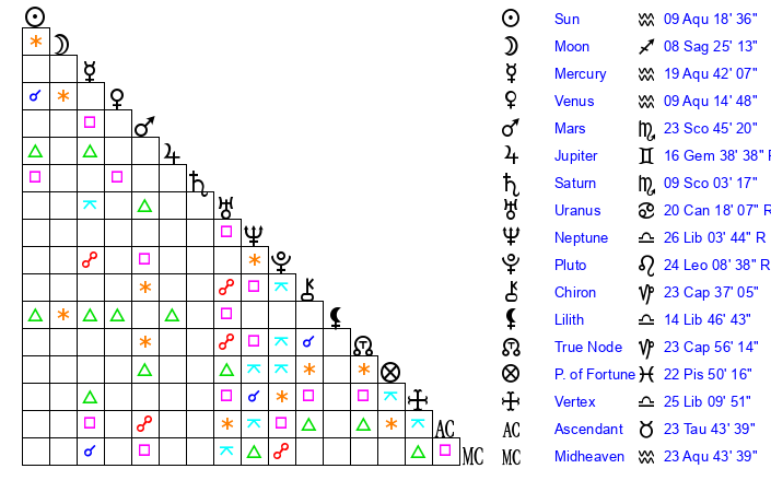 | Moon | 8 Sagittarius 20 | 12 Aquarius 55 | 26 Cancer 48 |