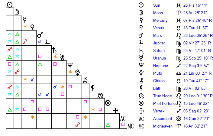 | Sun | 28 Pisces 15 | 28 Pisces 21 | 12 Taurus 26 |