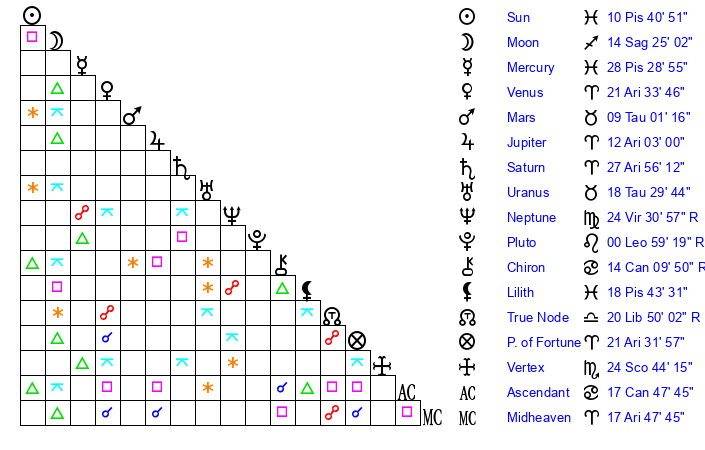 Moon | 14 Sagittarius 23 | 29 Pisces 59 | 22 Capricorn 55 |
