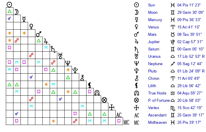 | Saturn | 0 Gemini 21 | 19 Pisces 58 | 4 Gemini 40 |