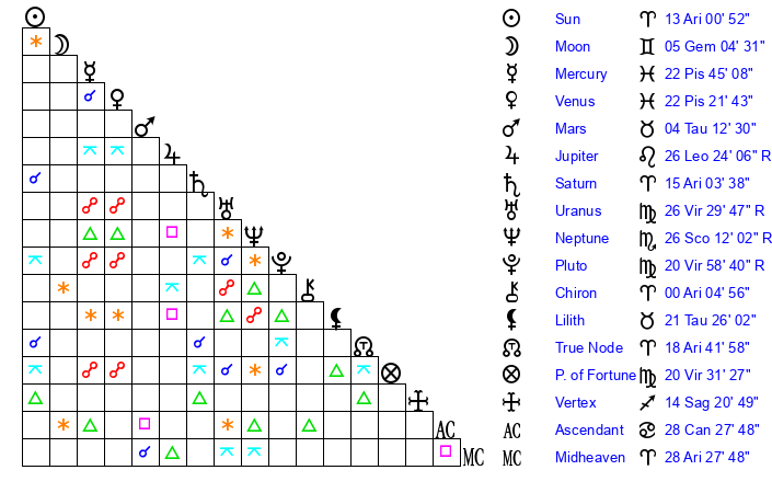 | Sun | 13 Aries 1 | 13 Aries 12 | 8 Gemini 22 |