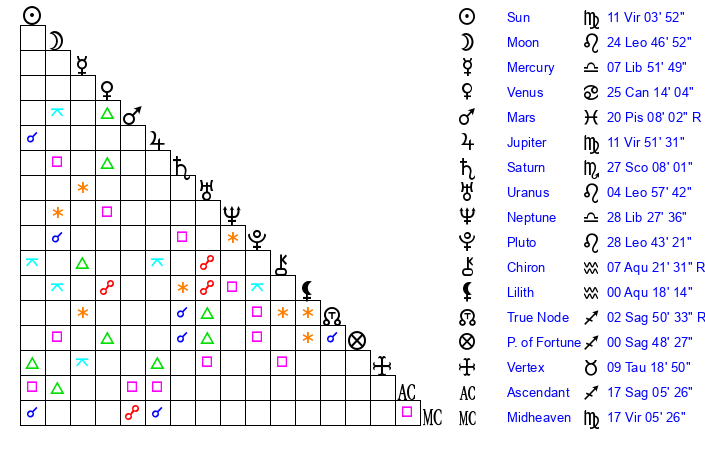 | Mercury | 7 Libra 51 | 2 Virgo 3 | 18 Scorpio 27 |