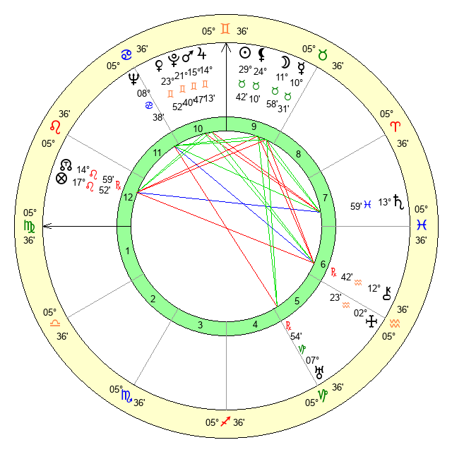 | Sun | 29 Taurus 43 | 0 Gemini 53 | 23 Virgo 53 |