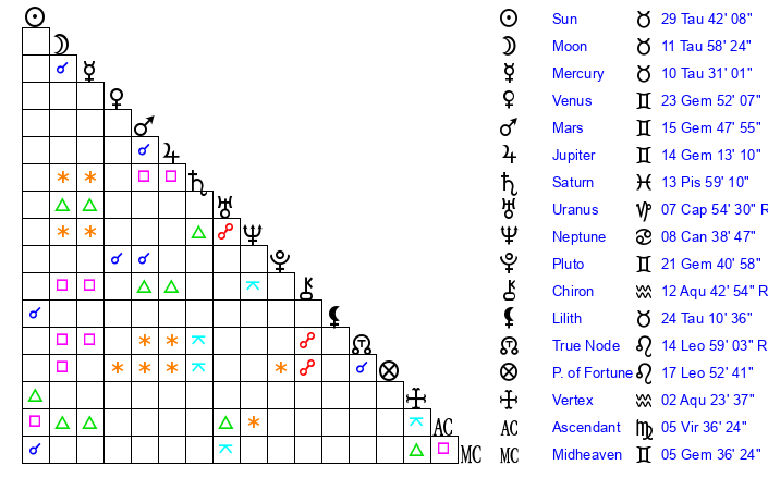 | Moon | 11 Taurus 54 | 16 Pisces 12 | 13 Virgo 24 |