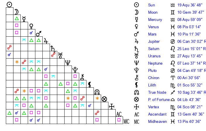 | Sun | 19 Aquarius 36 | 20 Aquarius 54 | 4 Gemini 6 |