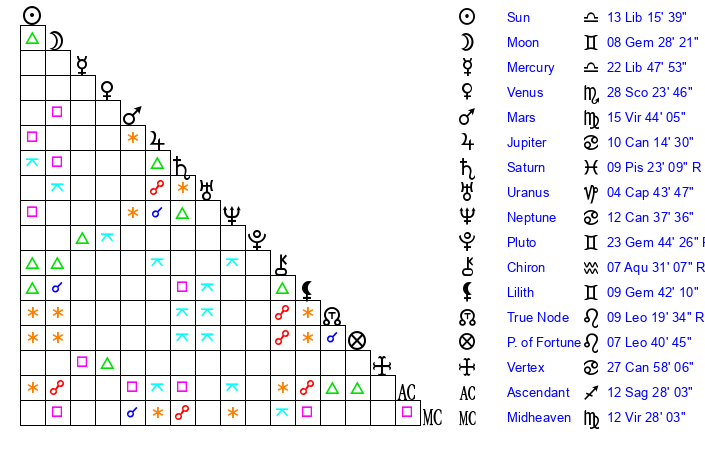 | Sun | 13 Libra 16 | 14 Libra 26 | 13 Aquarius 29 |