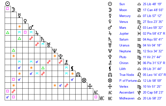 | Moon | 17 Cancer 51 | 6 Libra 12 | 29 Libra 3 |