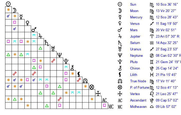 | Sun | 10 Scorpio 36 | 11 Scorpio 16 | 13 Pisces 13 |