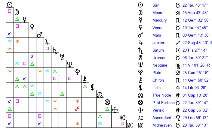 | Moon | 15 Aquarius 40 | 4 Sagittarius 13 | 28 Taurus 37 |