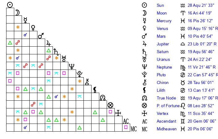 | Saturn | 20 Aquarius 6 | 19 Pisces 15 | 28 Aquarius 0 |