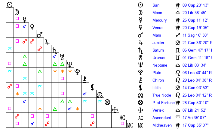 | Moon | 20 Libra 37 | 19 Capricorn 58 | 23 Libra 45 |