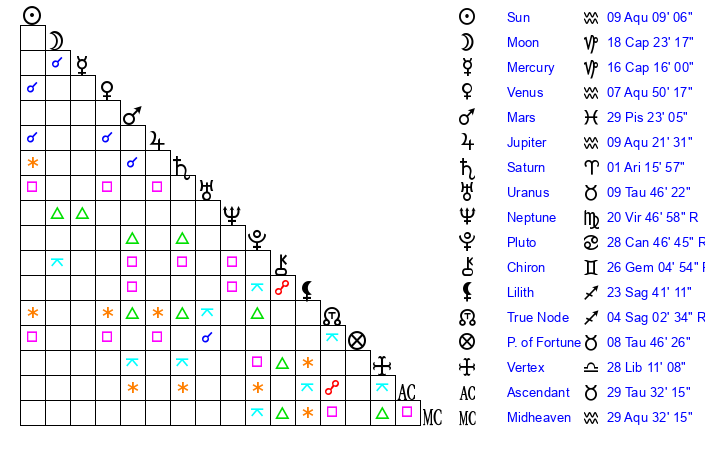 | Moon | 18 Capricorn 22 | 12 Aquarius 20 | 20 Pisces 19 |