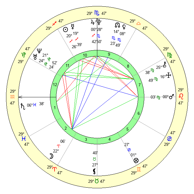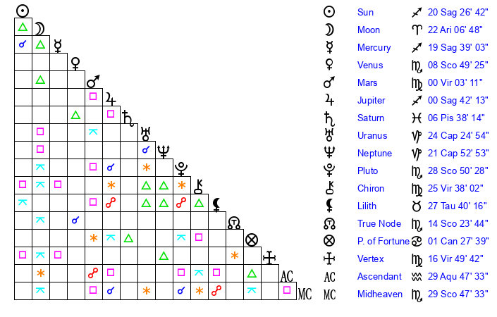 Pluto | 28 Scorpio 50 | 0 Aquarius 30 | 29 Scorpio 50 |