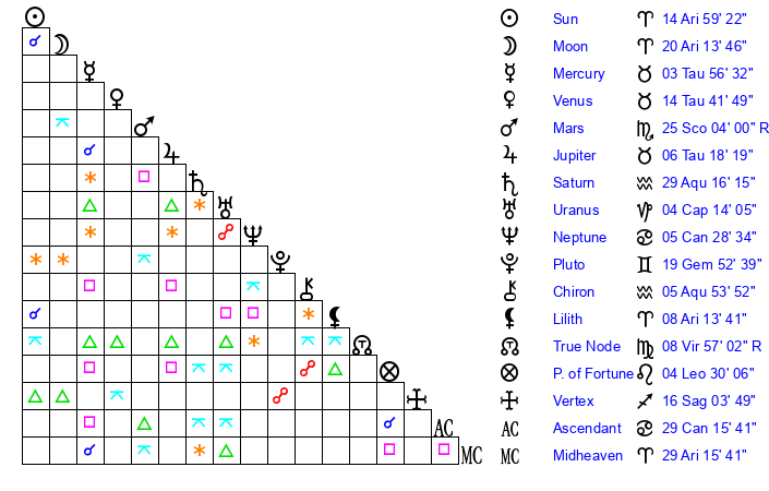| Sun | 14 Aries 59 | 15 Aries 55 | 10 Leo 25 |