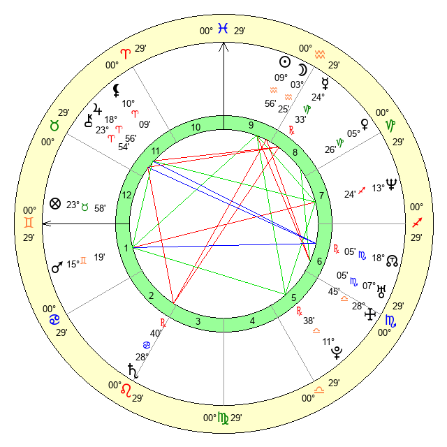 | Sun | 9 Aquarius 56 | 11 Aquarius 3 | 29 Pisces 13 |