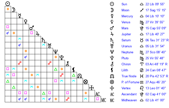 | Pluto | 25 Virgo 56 | 1 Aquarius 21 | 27 Virgo 17 |