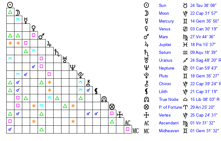 | Sun | 24 Taurus 38 | 26 Taurus 4 | 21 Virgo 39 |