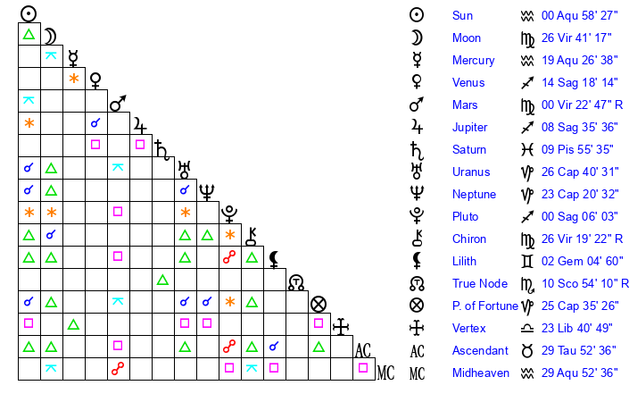| Pluto | 0 Sagittarius 5 | 1 Aquarius 42 | 0 Sagittarius 33 |