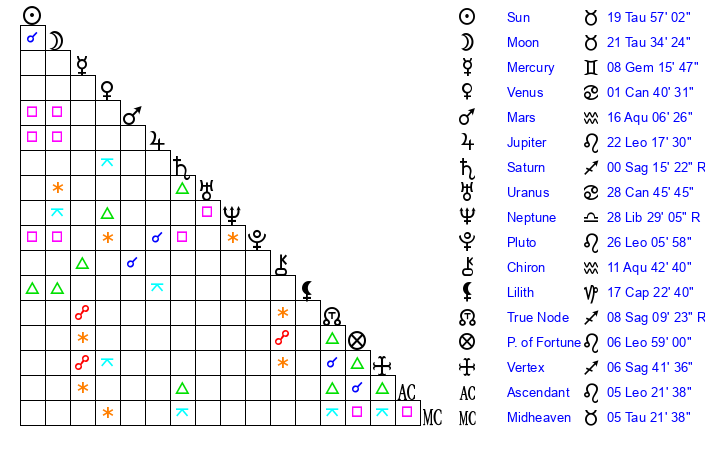 | Sun | 19 Taurus 57 | 20 Taurus 15 | 25 Cancer 58 |