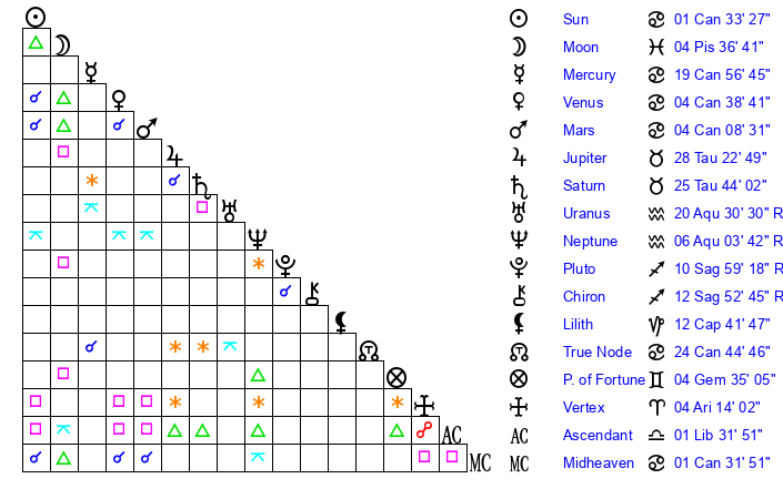 Moon | 4 Pisces 28 | 23 Taurus 52 | 7 Aquarius 43 |