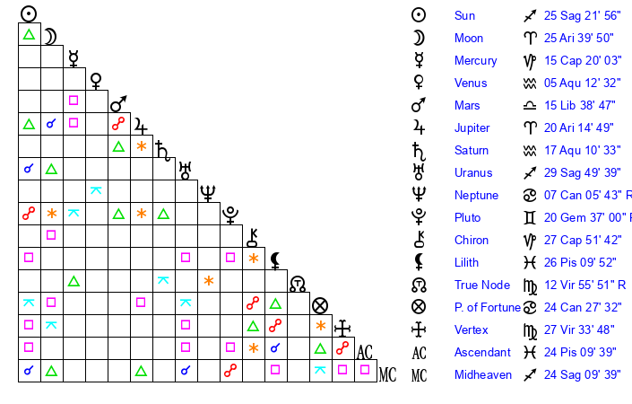 | Venus | 5 Aquarius 13 | 21 Sagittarius 13 | 12 Taurus 0 |