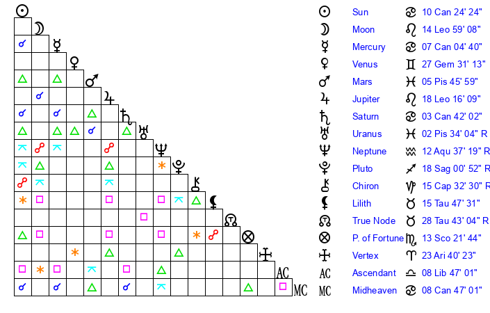 Mercury | 7 Cancer 5 | 6 Leo 56 | 20 Leo 40 |