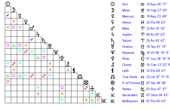 | Mercury | 19 Aquarius 24 | 14 Aquarius 22 | 19 Aries 16 |