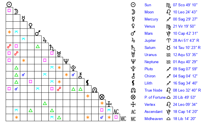 | Venus | 21 Virgo 20 | 16 Sagittarius 45 | 18 Libra 15 |